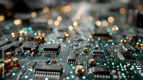 Obraz premium CloseUp of a Circuit Board with Bokeh Lights Highlighting Technology and...