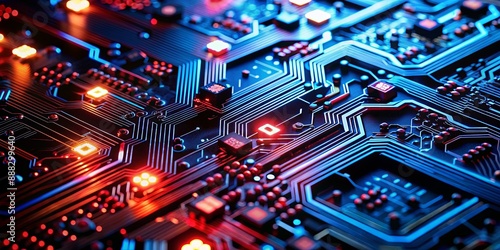 Obraz premium Closeup of a Circuit Board with Red and Blue Lights, Digital, Technology,...