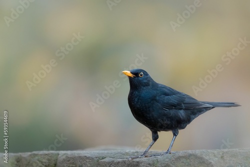 Obraz premium Closeup of a Common blackbird perhcing on the stone on a blurred background