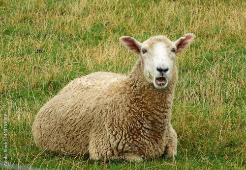 © Nina, Obraz premium closeup of a coopworth sheep with a surrpised look, resting in a pasture near balclutha in south otago on the south island of new zealand