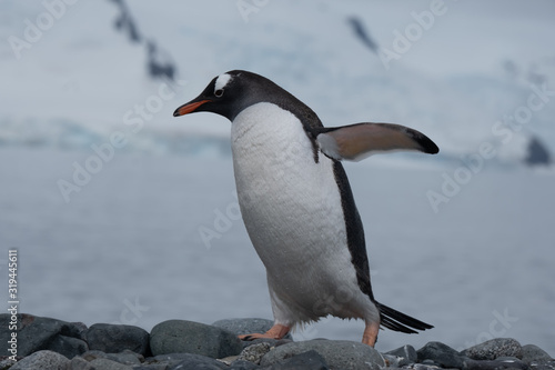 Fototapeta premium Closeup of a cute Gentoo penguin clumsily walking on a beach at Yankee...