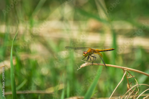 © Eugene Put, Fototapeta premium Closeup of A Dragonfly, Blurred Green Meadow Background, Bright Sunny Summer Day