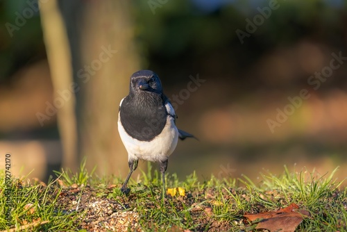 Obraz premium Closeup of a European magpie (Pica pica) against blurred background