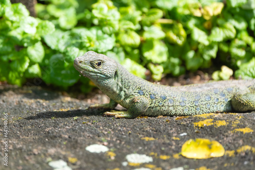 Fototapeta premium Closeup of a European ocellated lizard on a rock
