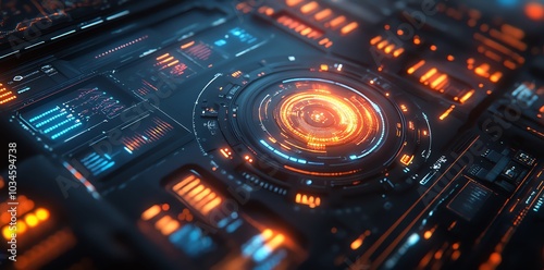 Obraz premium Closeup of a futuristic digital interface with glowing orange and blue lights.