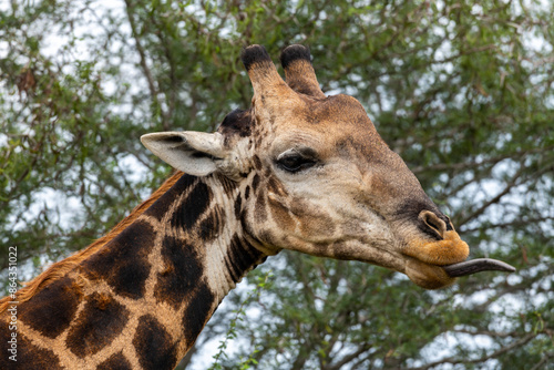 Fototapeta premium Closeup of a giraffe with its tongue sticking out, Kruger National Park,...