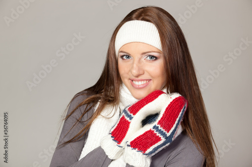 © paffy, Fototapeta premium Closeup of a girl in warm clothing, over grey background