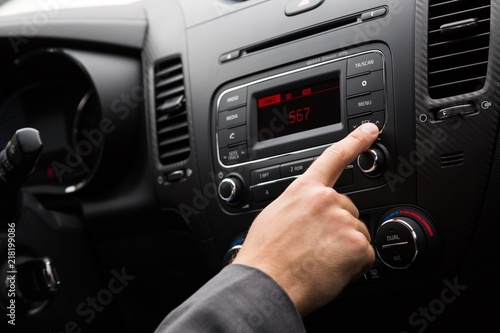 © BillionPhotos.com, Fototapeta premium Closeup of a Hand Pressing a Button of a Car Audio System