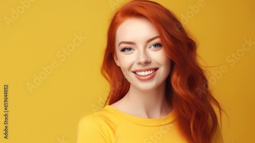 © Boris, Fototapeta premium Closeup of a happy pretty redhead young woman with long wavy hair and freckles wearing a stylish t-shirt feels satisfied and looks confident isolated over a yellow background.