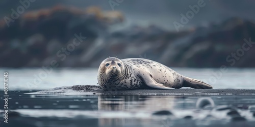 © GB, Obraz premium Closeup of a harbor seal resting on the shore