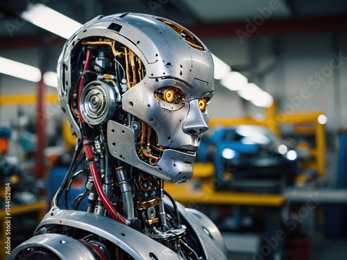 © Leopard, Fototapeta premium Closeup of a humanoid robot showing intricate design and detailing in a modern workshop environment