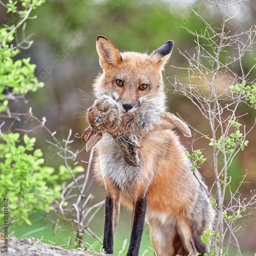 Fototapeta premium Closeup of a Kit fox holding a rabbit in its mouth, standing in green shrubs
