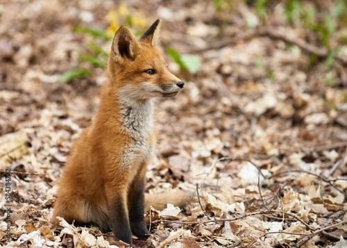 © Joewilson/Wirestock Creators, Fototapeta premium Closeup of a kit fox (Vulpes macrotis) in a forest against blurred background