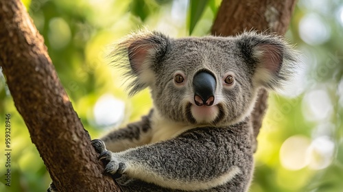 © Generative AI, Obraz premium Closeup of a Koala Phascolarctos cinereus sitting on a tree fork looking at camera green foliage in the background Koalas are native Australian marsupials : Generative AI