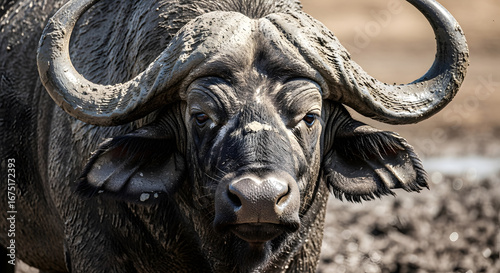 © shahporanshakil, Naklejka premium Closeup of a majestic african buffalo with large horns in its natural habitat