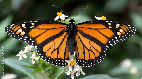 © iamtopkritsada, Fototapeta premium Closeup of a monarch butterfly feeding on milkweed, softfocus background, fine scale details