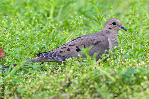 Obraz premium Closeup of a mourning dove resting in the grass.