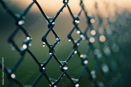 © Thanapong, Fototapeta premium Closeup of a rain-drenched wire fence outdoor setting nature photography evening light abstract viewpoint capturing the beauty of reflections on wire