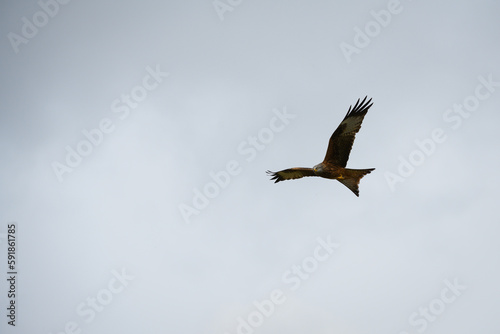 © Greg Lawson/Wirestock Creators, Obraz premium Closeup of a red kite flying high up in a blue sky with their wings wide open