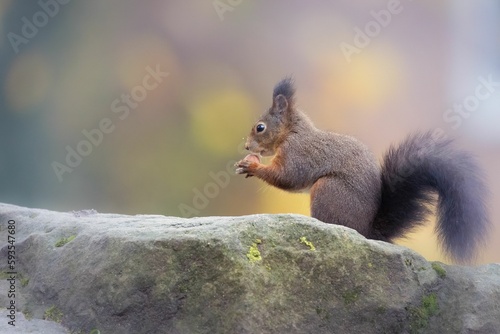 Obraz premium Closeup of a Red squirrel eating acorn in a forest