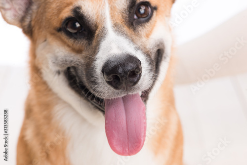 © makistock, Obraz premium Closeup of a small dog's tongue, white background