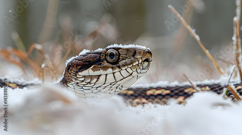 © KALEYA, Obraz premium Closeup of a Snow Covered Snake in Winter