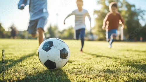 © BozStock, Fototapeta premium Closeup of a soccer ball in a field with three children running toward it in the background.
