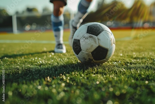 © Tanakorn, Fototapeta premium Closeup of a Soccer Ball on a Green Grass Field with a Player's Leg Blurred in the Background