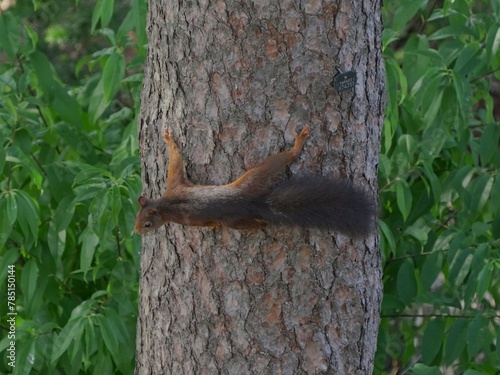 © Wirestock, Fototapeta premium Closeup of a squirrel hanging in a trunk and green leaves behind it