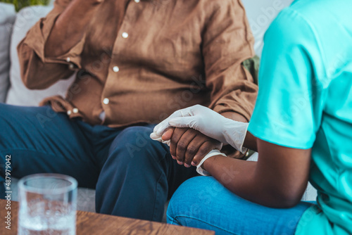 © Dragana Gordic, Fototapeta premium Closeup of a support hands. Closeup shot of a young woman holding a senior man's hands in comfort. Female carer holding hands of senior man