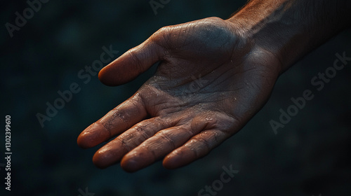 Fototapeta premium Closeup of a sweaty dark brown hand open palm upwards skin body part human...