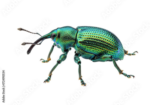 © PARVIN, Fototapeta premium Closeup of a vibrant green weevil isolated on a transparent background
