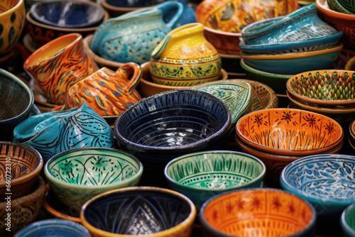 Fototapeta premium Closeup of a vibrant market stall texture featuring rows of handmade pottery in various sizes and shapes. The pottery is decorated with intricate designs in vibrant shades of greens, blues,