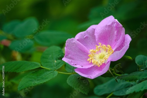 Fototapeta premium Closeup of a vibrant pink Nootka rose flower blooming amongst lush green...