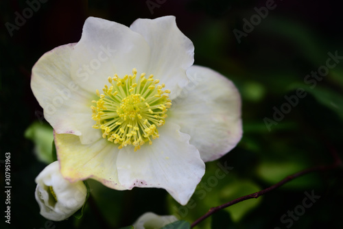 © leopictures, Fototapeta premium Closeup of a white Christmas rose with petals, pollen and leaves in winter