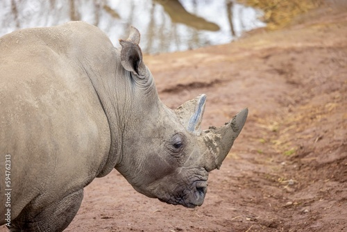 Fototapeta premium Closeup of a white rhino with a muddy horn.
