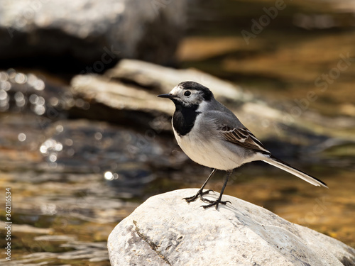 Obraz premium Closeup of a White Wagtail (Motacilla alba) standing on a rock at a river...