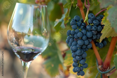 Fototapeta premium closeup of a wine glass beside grapes on a vine