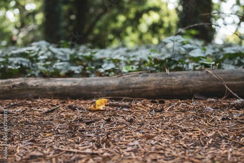 Obraz premium Closeup of a yellow leaf on the ground in a forest