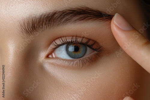Fototapeta premium Closeup Of A Young Woman Pointing To Wrinkles On Her Upper Eyelid, Focusing...