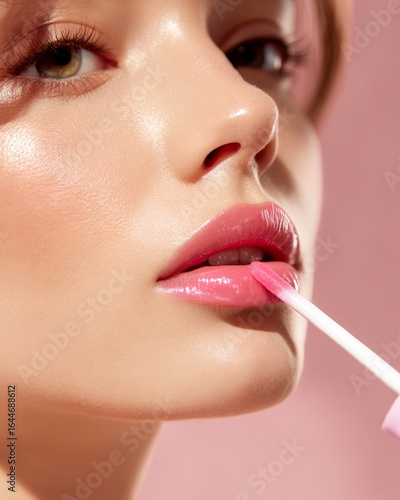 Obraz premium Closeup of a young woman using lip gloss smooth radiant skin natural beauty look soft lighting isolated on a pastel background premium cosmetic photography