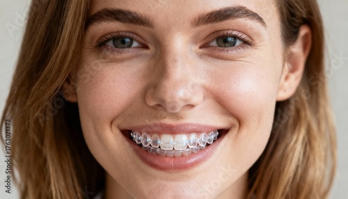 © Design Mystery, Fototapeta premium Closeup of a young woman with clear dental braces smiling brightly