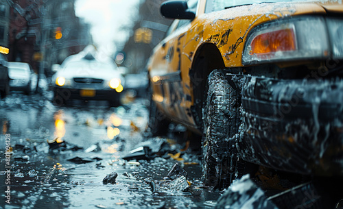 © Vadim, Fototapeta premium Closeup of an accident with two cars on the road, focusing on a damaged black car after a traffic crash in the city during the day