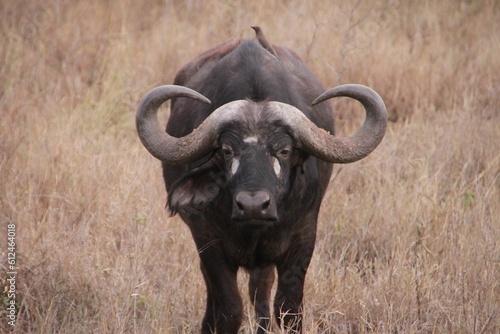 Fototapeta premium Closeup of an African buffalo against the yellow field