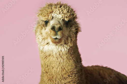 © MDBPIXS, Obraz premium Closeup of an Alpaca against pink background