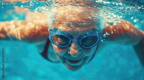Fototapeta premium Closeup of an elderly woman swimming with determination in a lap pool, vibrant colors