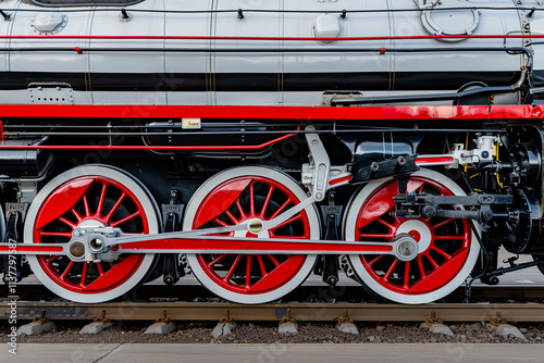© Dmitriy, Naklejka premium Closeup of an old steam locomotive wheel, showcasing the intricate engineering and historical significance of vintage transportation.