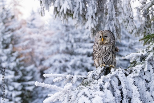 Naklejka premium Closeup of an Ural owl perched on a pine tree branch covered in the snow in a...