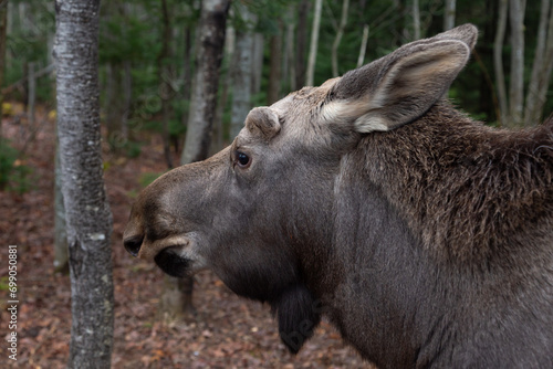 Fototapeta premium Closeup of baby moose standing in profile in forest, Beauce region, Quebec, Canada