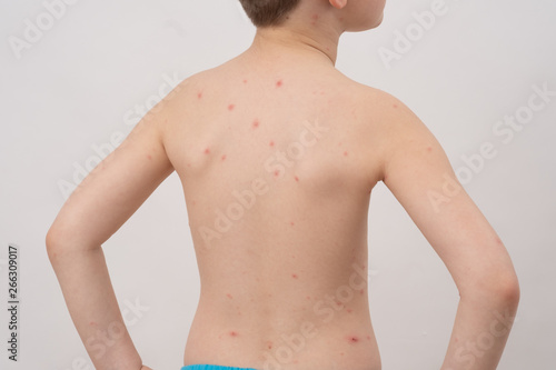 © Volodymyr Shcherbak, Fototapeta premium Closeup of back of boy with Varicella virus or Chickenpox. Bubble rash on child.